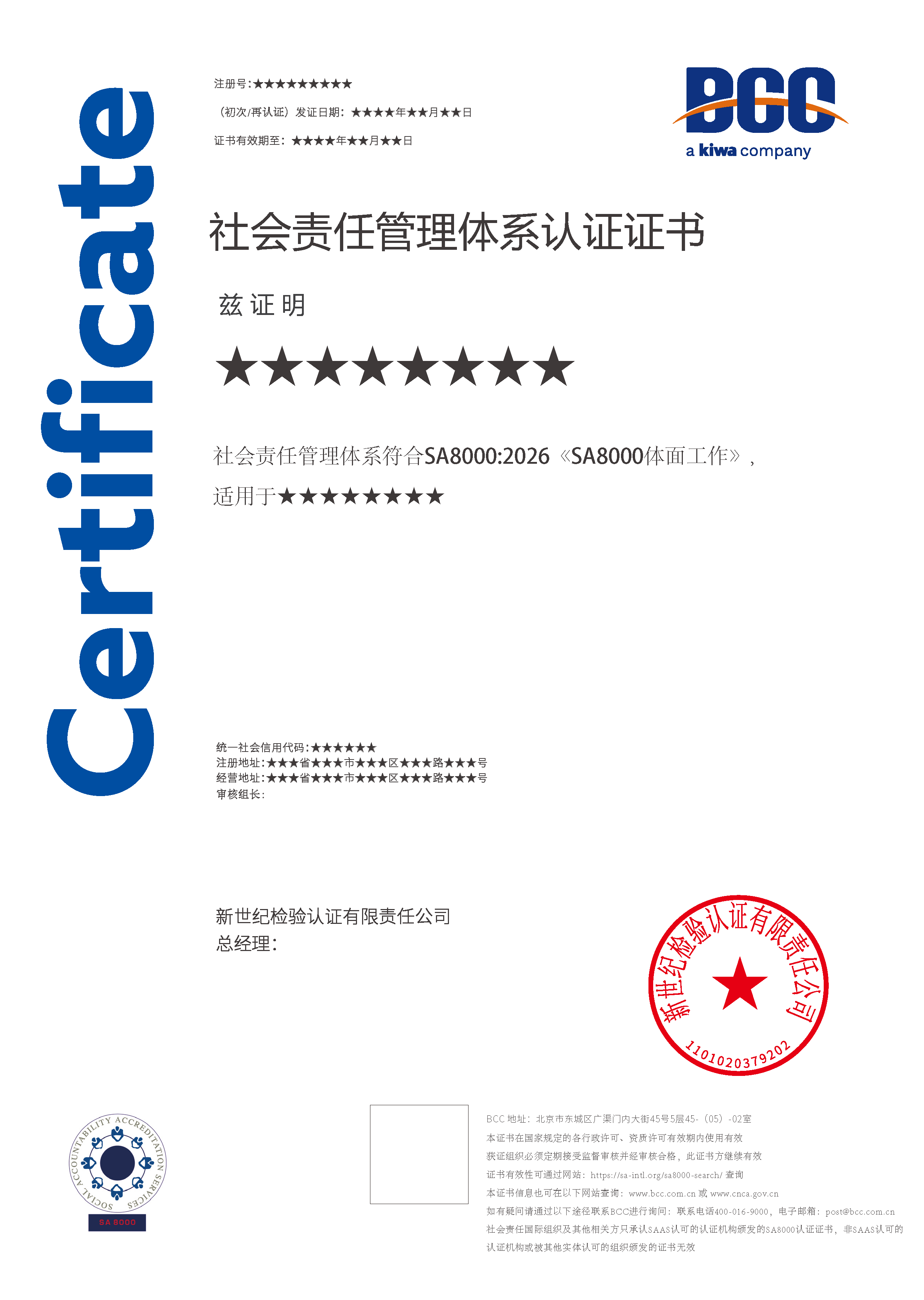 社會責(zé)任管理體系(SA8000)是全球首個道德規(guī)范國際標(biāo)準(zhǔn),其宗旨是確保供應(yīng)商所供應(yīng)的產(chǎn)品,皆符合社會責(zé)任標(biāo)準(zhǔn)的要求,目的是保護(hù)勞動環(huán)境和條件、勞工權(quán)利等。