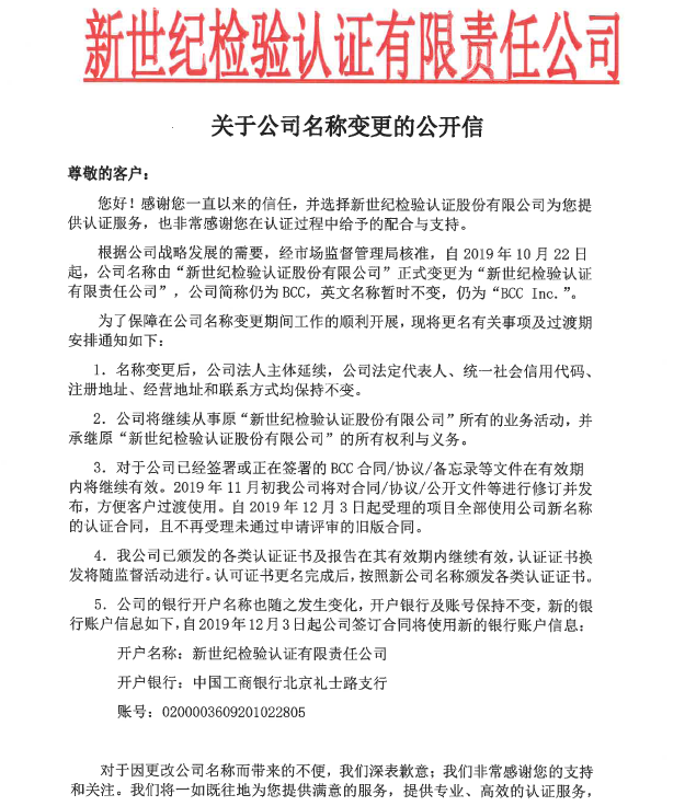 根據(jù)公司戰(zhàn)略發(fā)展的需要,經(jīng)市場監(jiān)督管理局核準(zhǔn),自2019年10月22日起,公司名稱由“新世紀(jì)檢驗(yàn)認(rèn)證股份有限公司”正式變更為“新世紀(jì)檢驗(yàn)認(rèn)證有限責(zé)任公司”,公司簡稱仍為BCC,英文名稱暫時不變,仍為“BCC Inc.”。