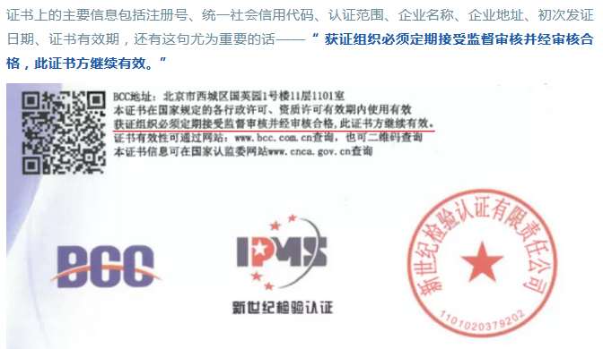 證書(shū)上的主要信息包括注冊(cè)號(hào)、統(tǒng)一社會(huì)信用代碼、認(rèn)證范圍、企業(yè)名稱、企業(yè)地址、初次發(fā)證日期、證書(shū)有效期,還有這句尤為重要的話——“ 獲證組織必須定期接受監(jiān)督審核并經(jīng)審核合格,此證書(shū)方繼續(xù)有效。”
