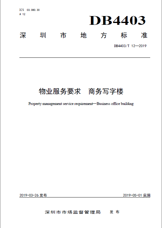 深圳市市場(chǎng)監(jiān)管局自2016年開始籌備物業(yè)服務(wù)認(rèn)證工作,歷經(jīng)三年多,在深圳標(biāo)準(zhǔn)認(rèn)證聯(lián)盟和標(biāo)準(zhǔn)技術(shù)研究院的大力支持下,中航物業(yè)和SGS通標(biāo)標(biāo)準(zhǔn)技術(shù)服務(wù)有限公司經(jīng)過行業(yè)走訪調(diào)研、專業(yè)論證、條款編寫、標(biāo)準(zhǔn)評(píng)審,終于在2019年5月1日聯(lián)合發(fā)布了首個(gè)服務(wù)類深圳認(rèn)證標(biāo)準(zhǔn)DB 4403/T 12—2019《物業(yè)服務(wù)要求 商務(wù)寫字樓》,標(biāo)準(zhǔn)引入了先進(jìn)的服務(wù)接觸理論和服務(wù)質(zhì)量評(píng)價(jià)模型,從客戶感知和企業(yè)自身管理兩個(gè)角度提出服務(wù)要求和管理要求,結(jié)合深圳市商務(wù)寫字樓的先進(jìn)技術(shù)和先進(jìn)方法,具有較強(qiáng)的科學(xué)性和適用性,達(dá)到了國(guó)內(nèi)領(lǐng)先、國(guó)際一流水平。認(rèn)證按照深圳標(biāo)準(zhǔn)認(rèn)證聯(lián)盟發(fā)布的首個(gè)服務(wù)認(rèn)證實(shí)施規(guī)則實(shí)施。