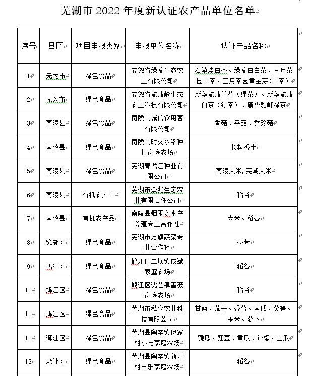 蕪湖市對年度新認證有機農(nóng)產(chǎn)品公示