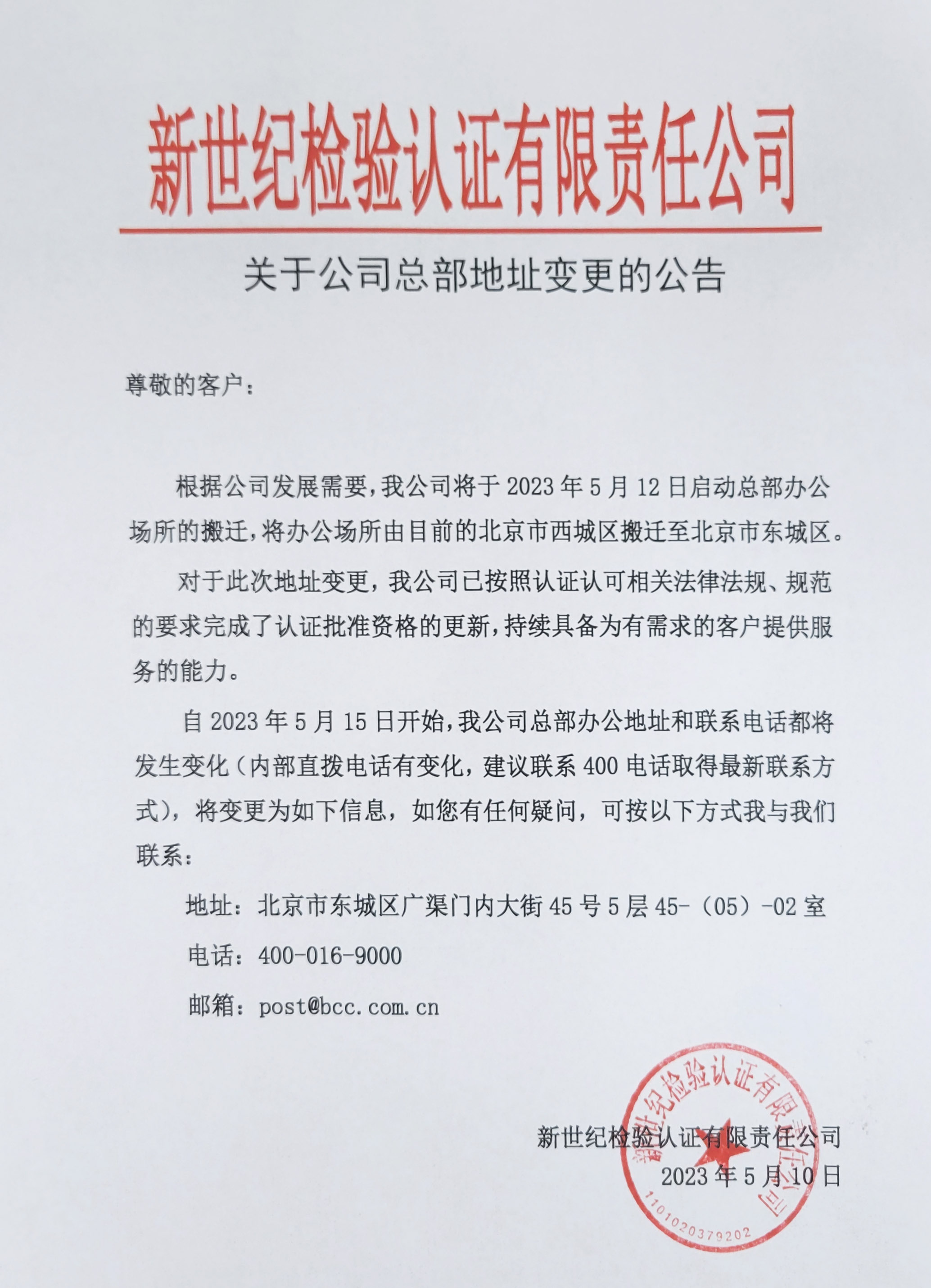 自2023年5月15日開始,我公司總部辦公地址和聯(lián)系電話部將發(fā)生變化(內部直撥電話有變化,建議聯(lián)系400電話取得最新聯(lián)系方式),將變更為如下信息,如您有任何疑問,可按以下方式我與我們聯(lián)系: