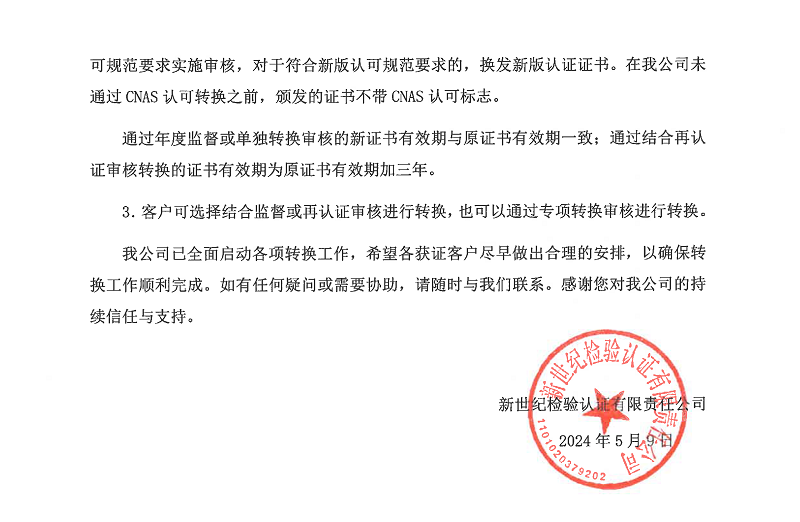 2.2024年6月1日起,我公司不再實(shí)施基于舊版認(rèn)可規(guī)范的審核,開(kāi)始按照新版認(rèn)可規(guī)范要求實(shí)施審核,對(duì)于符合新版認(rèn)可規(guī)范要求的,換發(fā)新版認(rèn)證證書。在我公司未通過(guò)CNAS認(rèn)可轉(zhuǎn)換之前,頒發(fā)的證書不帶CNAS認(rèn)可標(biāo)志。