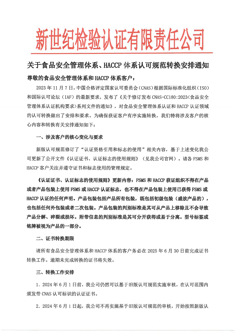 關(guān)于食品安全管理體系、HACCP體系認(rèn)可規(guī)范轉(zhuǎn)換安排通知